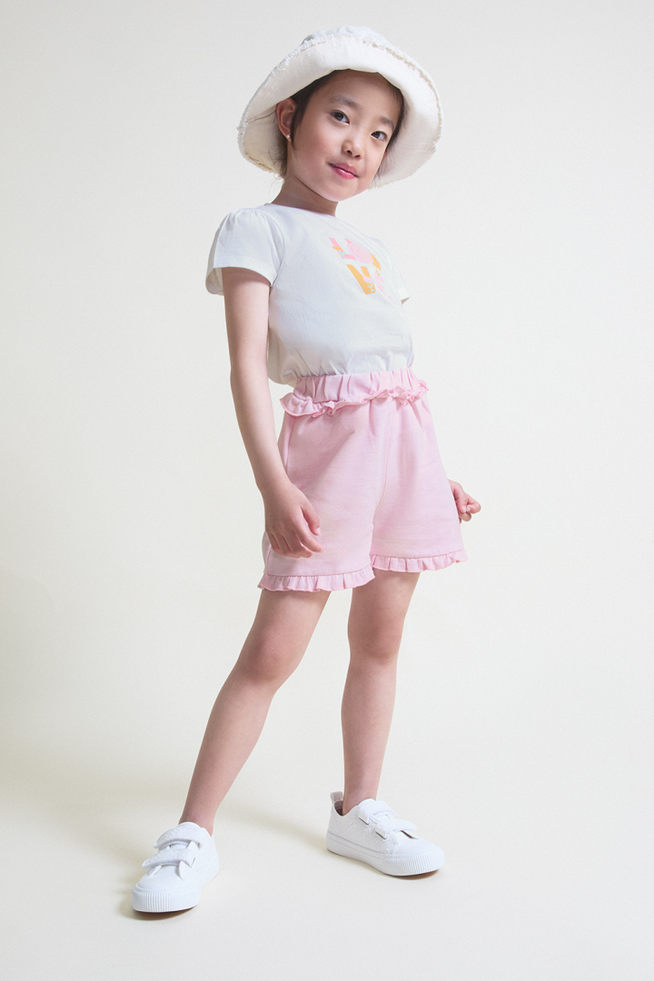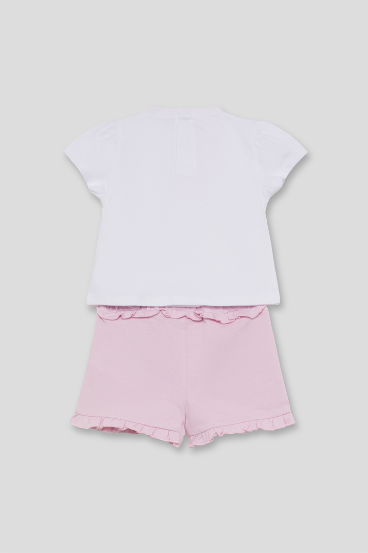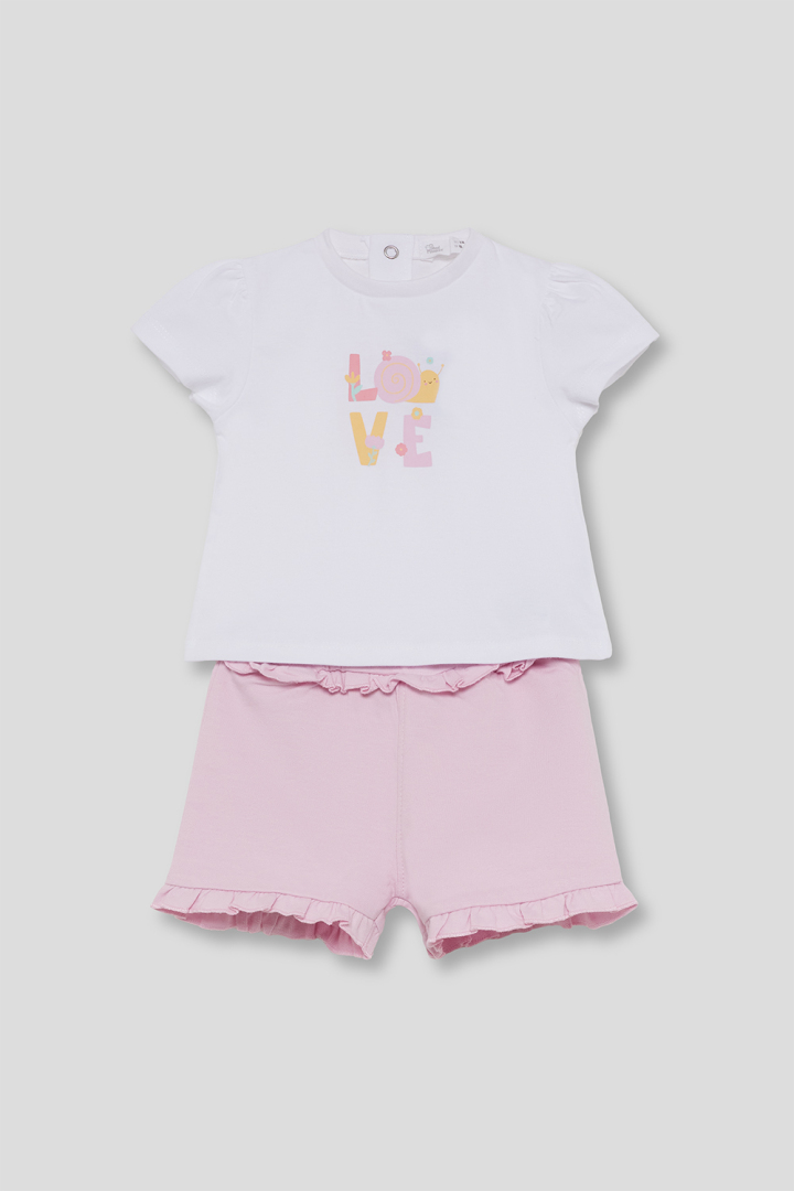Conjunto de dos piezas, camiseta y shorts para bebé niña de 12 meses a 6 años. Camiseta blanca con estampado central multicolor “LOVE” y cierre trasero con botones a presión. Shorts en color lila con volantes en la cintura y el bajo. Tejido cómodo y fresco para el verano.